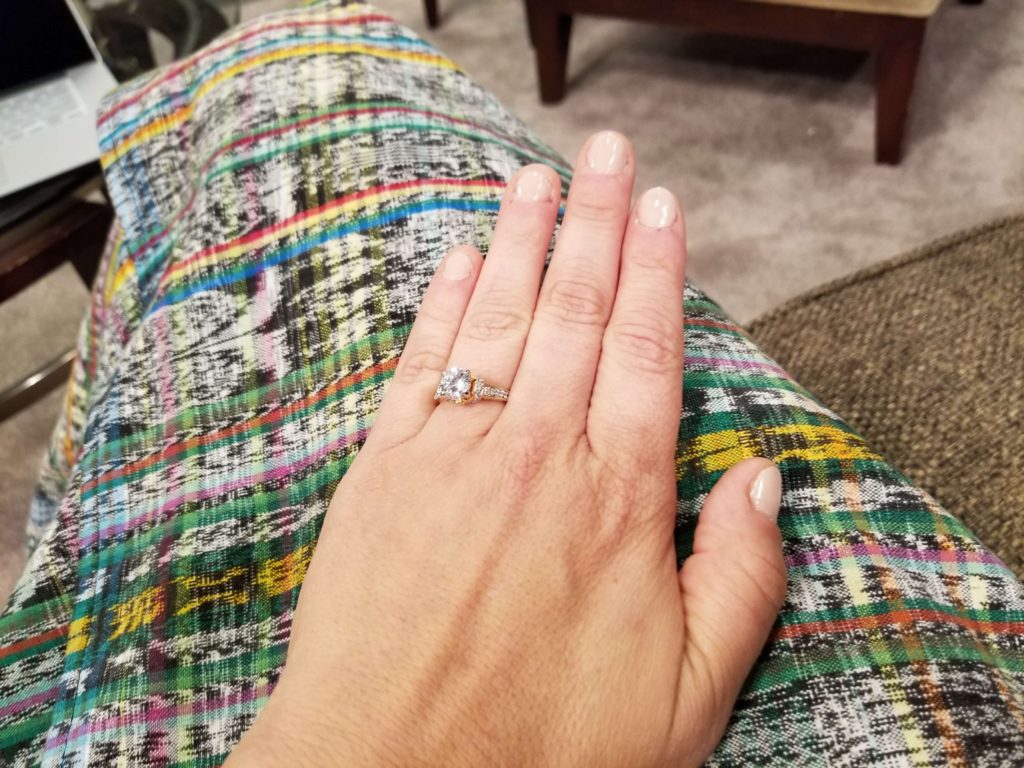 I decided to let Amy enjoy the process of being engaged much as she enjoyed having a tiara in the episode people most ask me about…So I let her do a little twirl and enjoy showing her ring off. Even though Amy is not a “fancy girl,” I think it’s healthy to show that even cerebral brainy types who have no fashion sense can enjoy the beauty of a ring and the process of an engagement. It doesn’t make her less of a strong female for doing so!