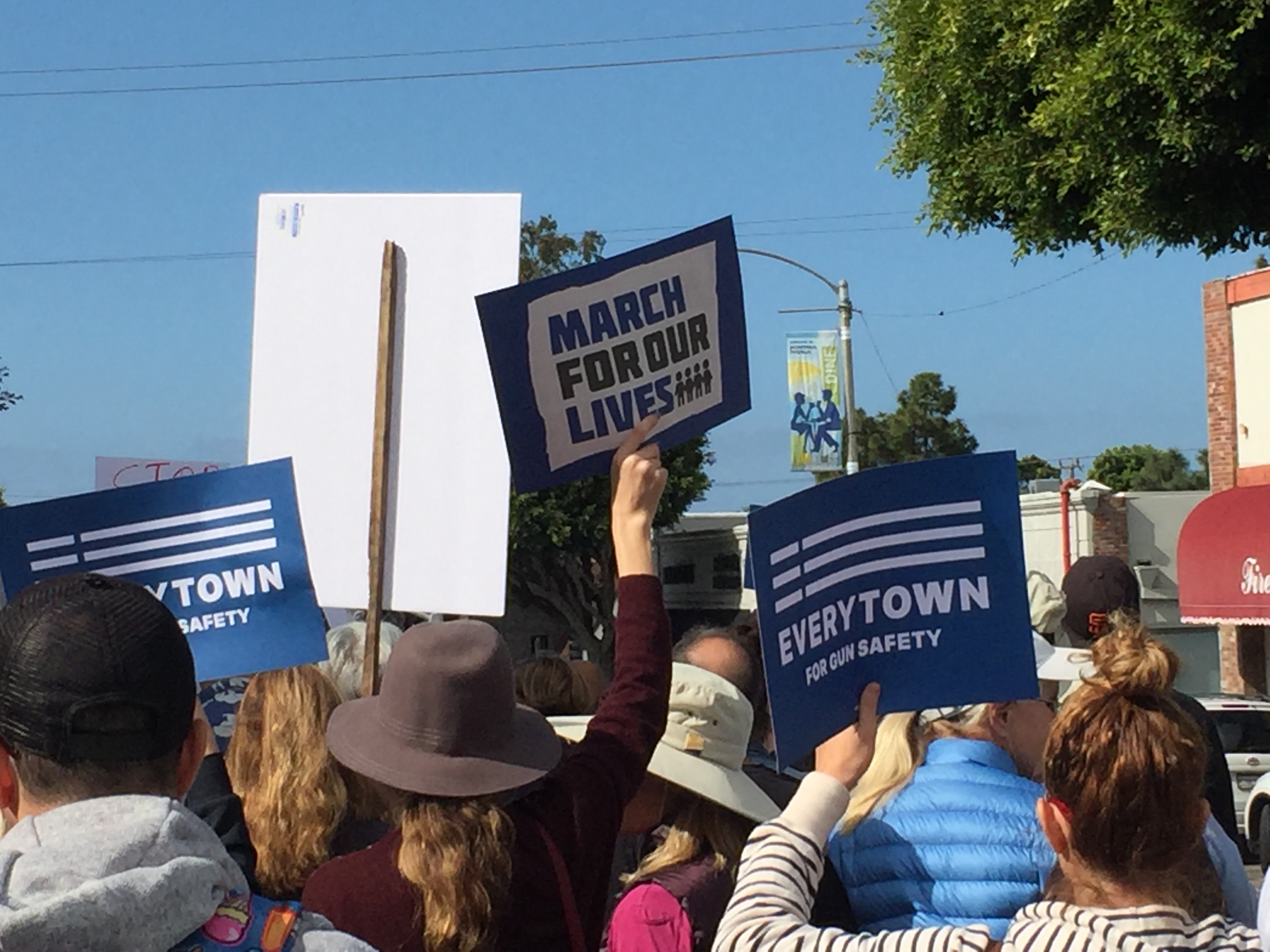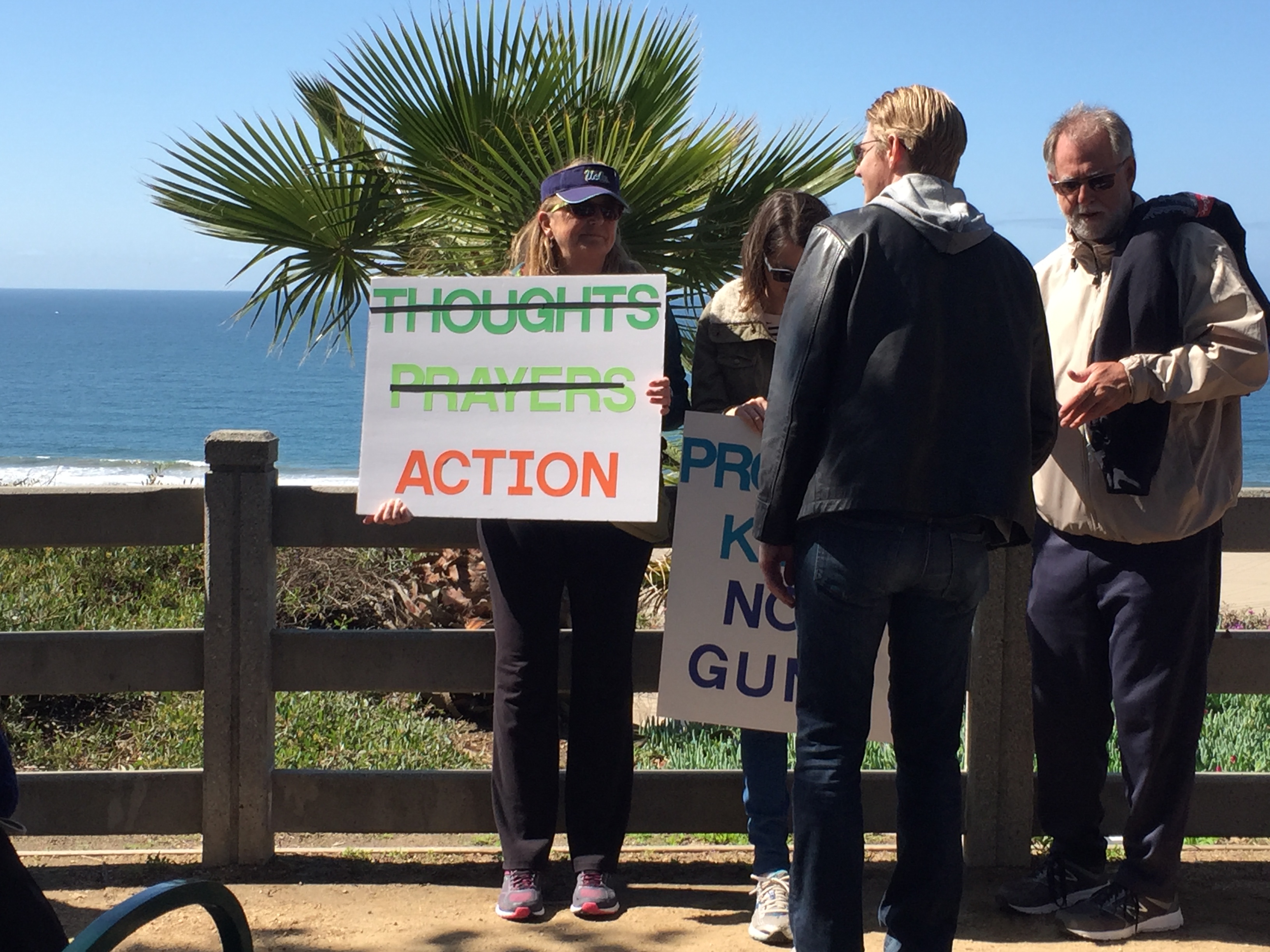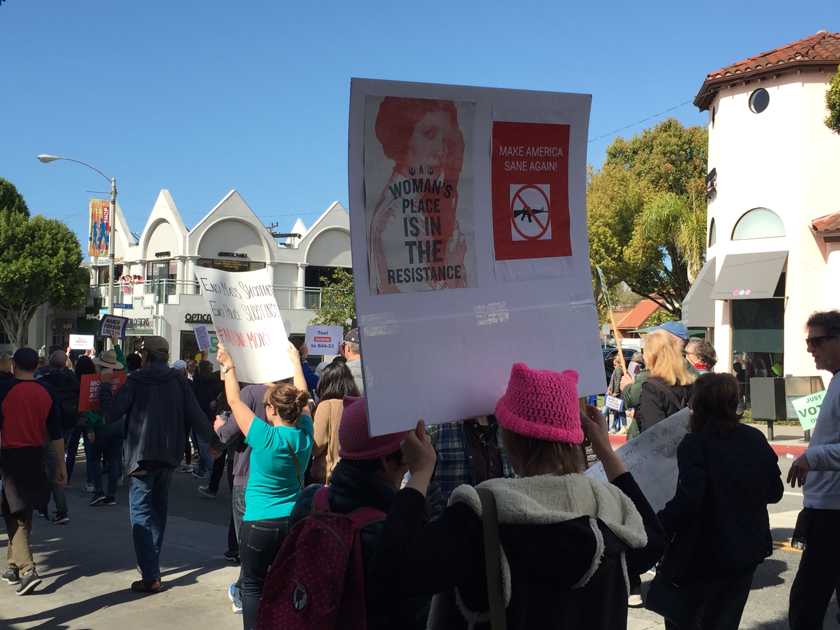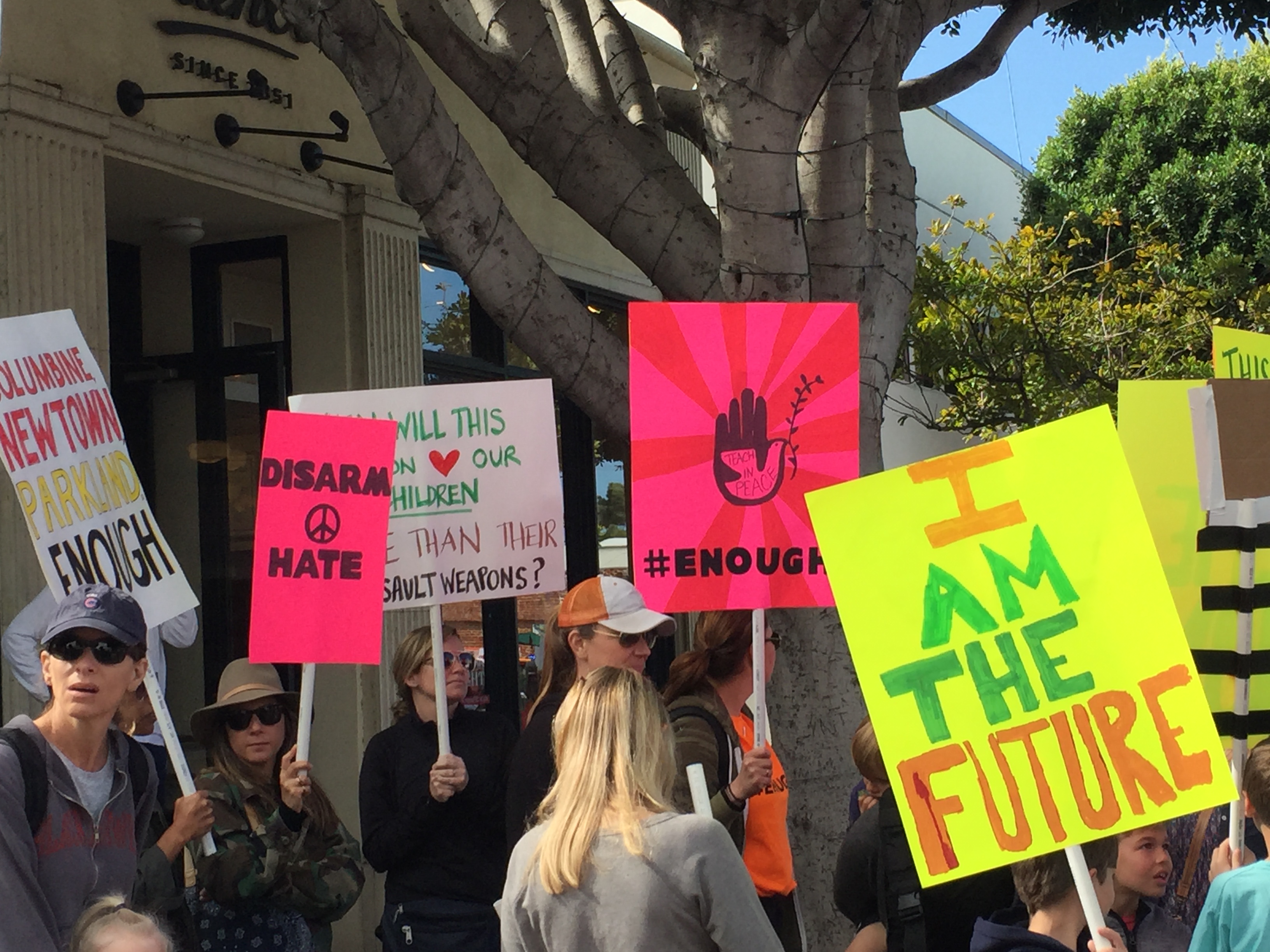 I went to the march in Santa Monica, which was very well-attended by people of all ages. The march’s route was about 1.5 miles along Montana Avenue and culminated in a rally at Palisades Park on Ocean Avenue, where family members who had lost loved ones to gun violence spoke to demand that the government change and we all increase the love and peace in the world. Because it was “in the neighborhood,” many people walked from their nearby homes: Parents pushed babies in strollers and older children marched in groups with their friends, holding the signs they’d made. While many people marched, there were those who had brunch at local businesses along the route and encouraged us as we passed.