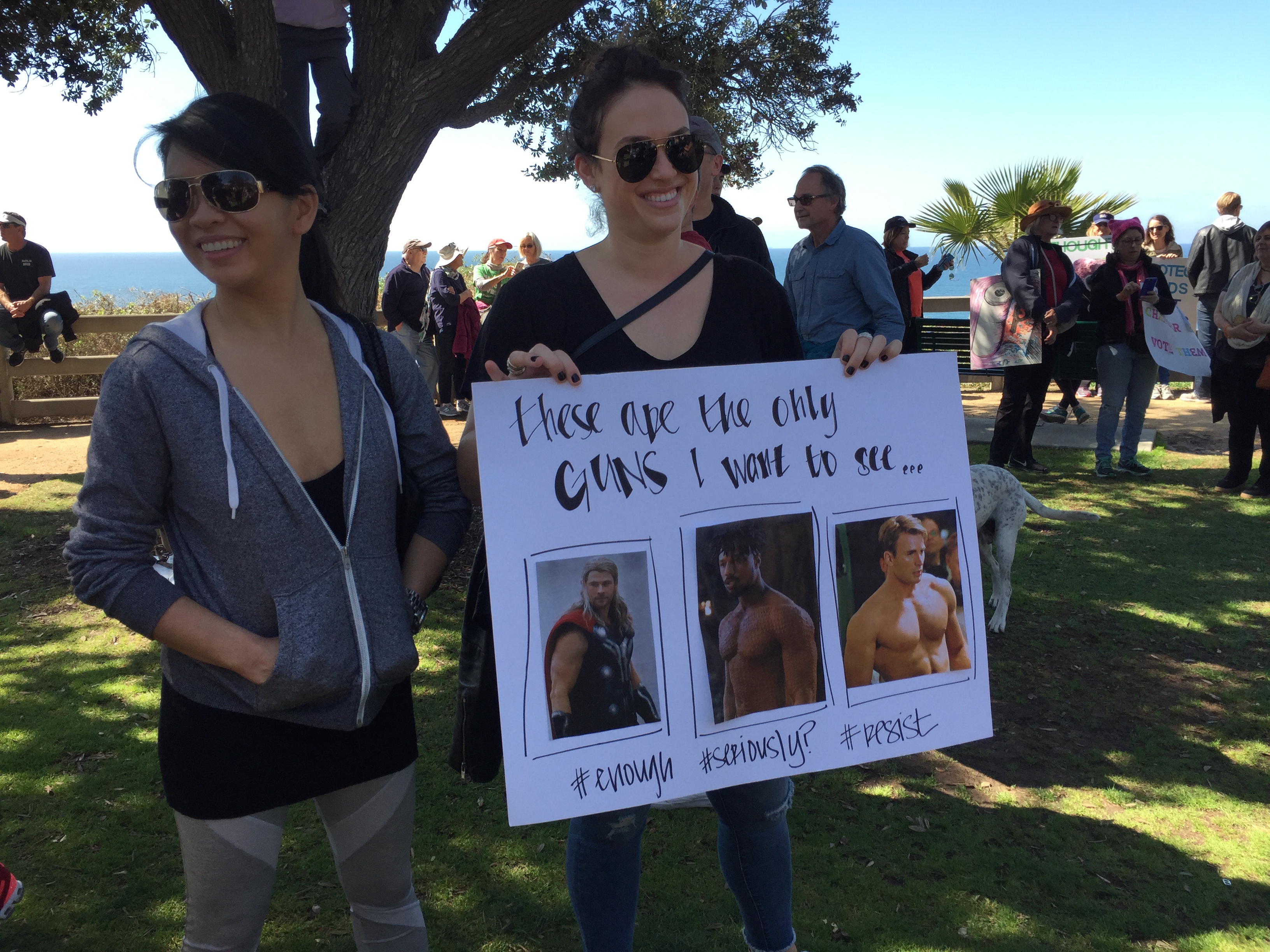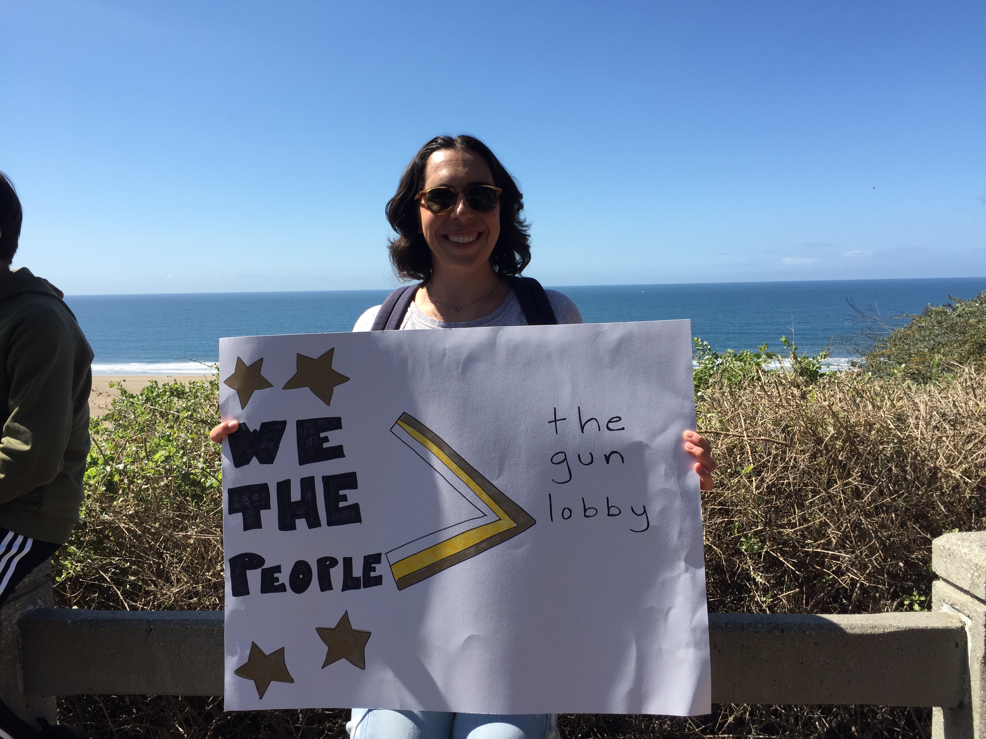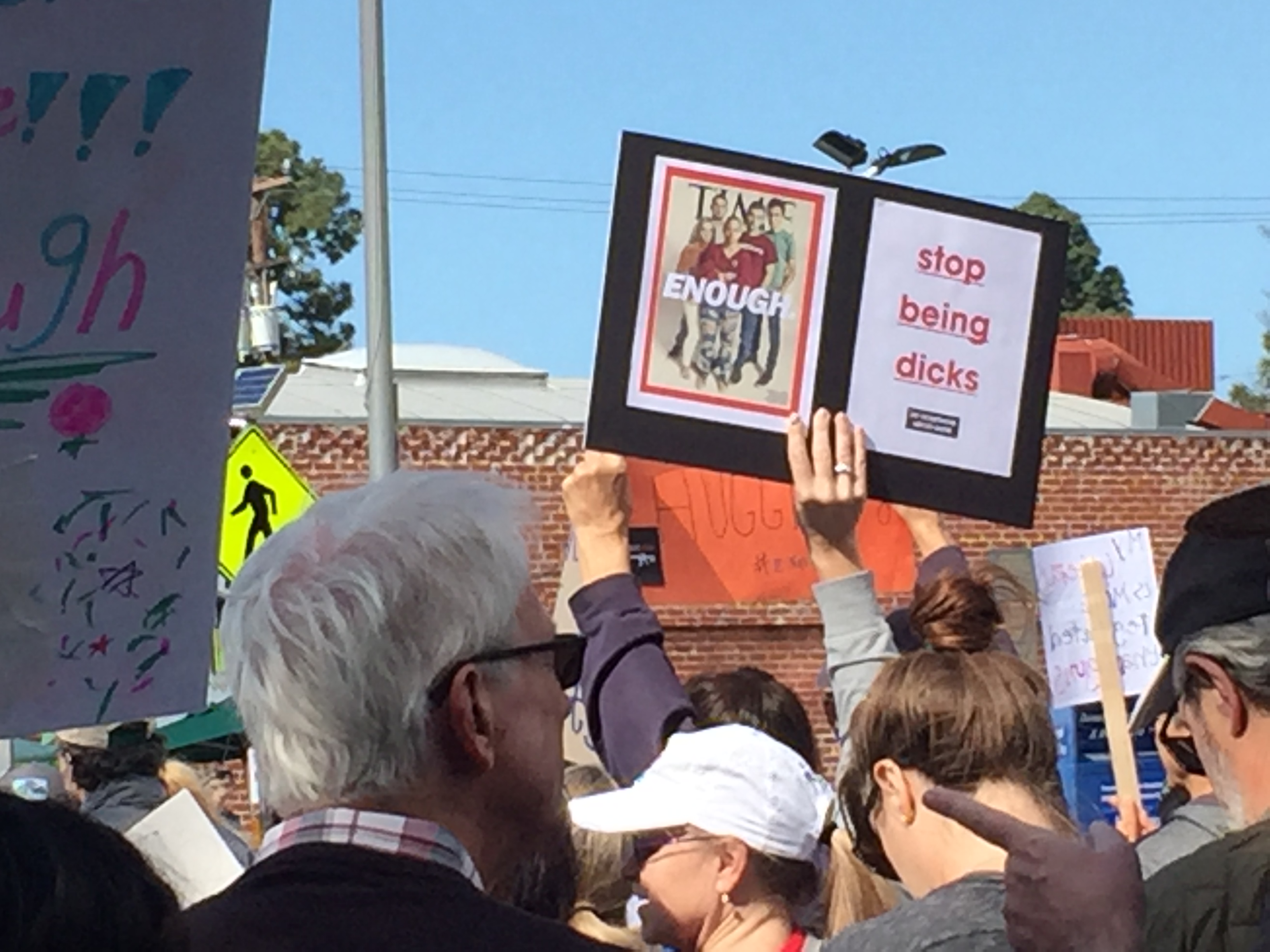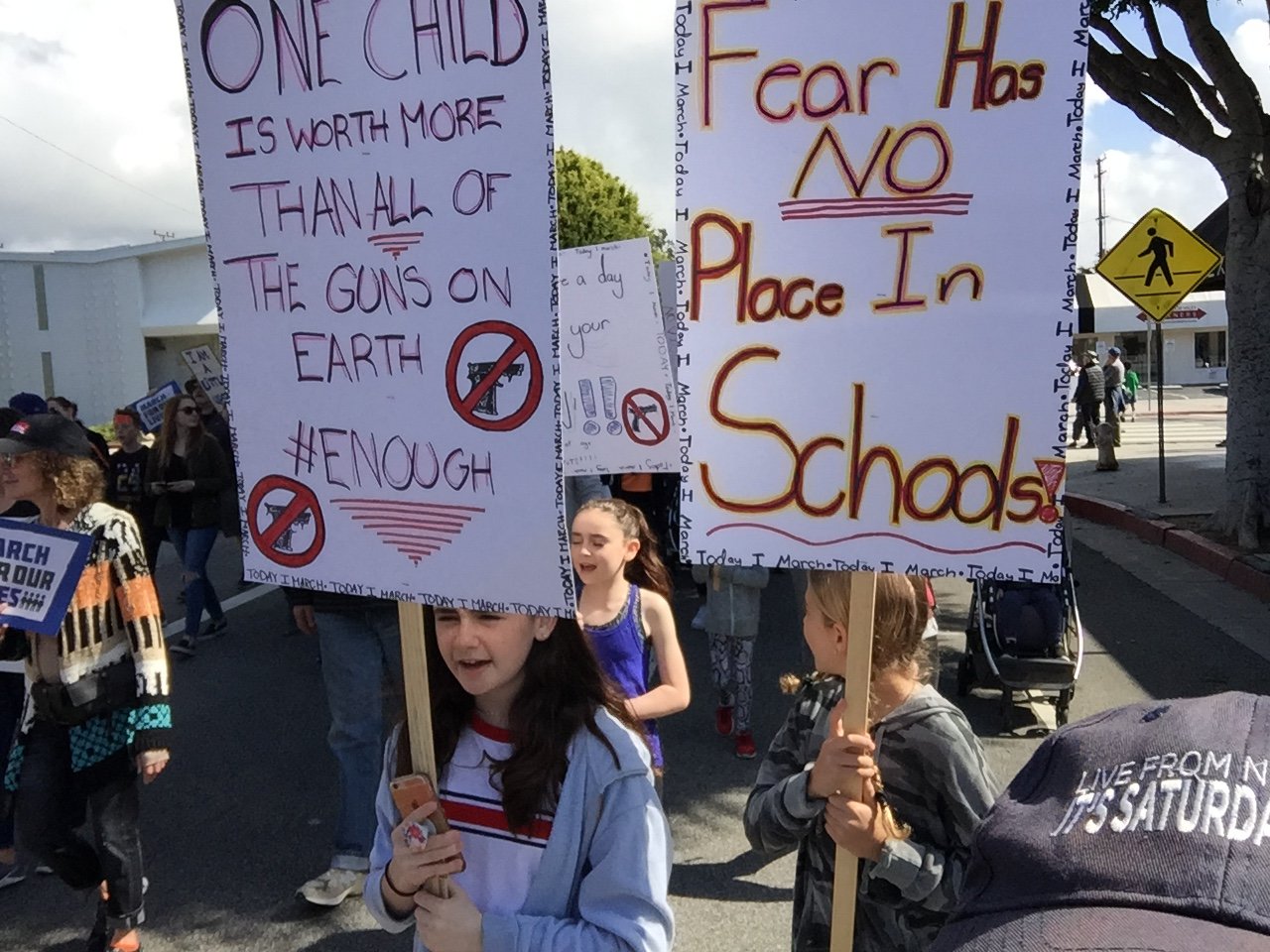 I went to the march in Santa Monica, which was very well-attended by people of all ages. The march’s route was about 1.5 miles along Montana Avenue and culminated in a rally at Palisades Park on Ocean Avenue, where family members who had lost loved ones to gun violence spoke to demand that the government change and we all increase the love and peace in the world. Because it was “in the neighborhood,” many people walked from their nearby homes: Parents pushed babies in strollers and older children marched in groups with their friends, holding the signs they’d made. While many people marched, there were those who had brunch at local businesses along the route and encouraged us as we passed.